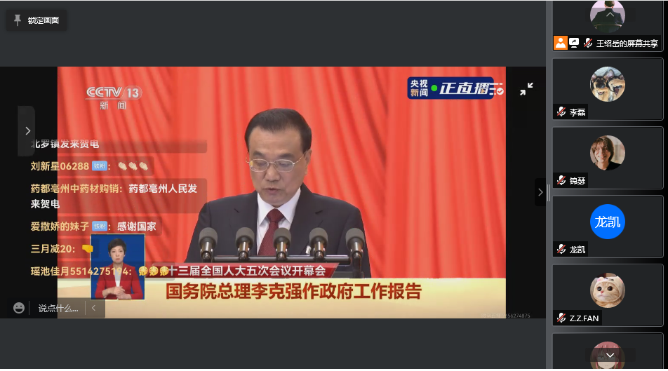 十三届全国人大五次会议和全国政协十三届五次会议分别于3月5日和3月4日在北京开幕,为积极响应学校号召,关注 “两会”动态,鼓励同学们结合自身学习、工作和生活实际领会两会精神,3月5日上午九点,太阳集团tyc97282020级硕、博士1班组织进行人大五次会议开幕会线上观看。