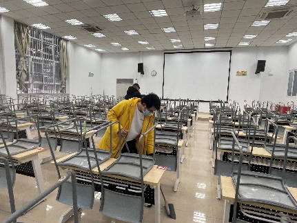 活动前,吴秀玲老师事先了解了考研自习室的卫生情况,明确了打扫工作的重心,同学们携带抹布、扫把等劳动工具准时到达自习室。活动过程中,大家都积极踊跃参与,分工明确,配合默契。大家先将自习室后的试卷资料进行整理归类,便于考研学子找到自己需要的资料,又认真清理角落里积累的灰尘、地面上遗留的垃圾,仔细擦拭桌面和玻璃门窗。白星老师带领学生将旁边的演播厅房间的杂物丢弃,桌上和旁边物品的灰尘擦掉,最后排齐桌椅。最后大家将室内电闸关闭,门窗锁好后有序离开了考研自习室,高效地完成了此次清理工作。经过同学们的共同努力,地面干净整洁、工具摆放整齐、书桌井然有序。