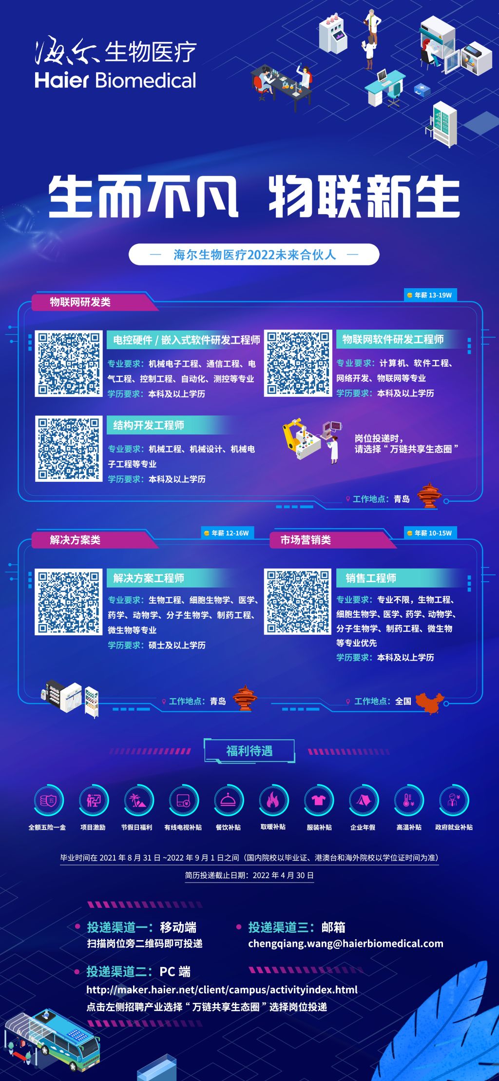 海尔生物医疗2022未来合伙人春季招聘开始了,海尔生物医疗是青岛首个科创板上市企业,始于生物医疗低温存储设备的研发、生产和销售,提供物联网生物科技解决方案。