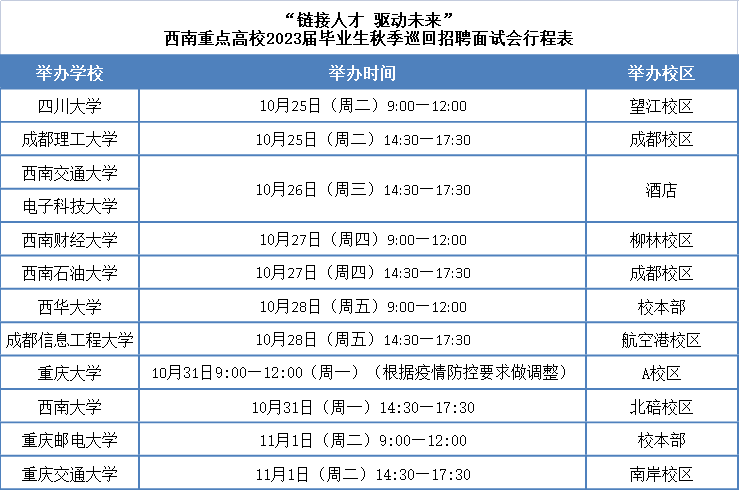 为进一步贯彻党中央、国务院关于做好高校毕业生就业工作的指示精神和决策部署,积极落实教育部“24365校园招聘服务”政策,未来校招拟于10月19日组织用人单位前往ok138cn太阳集团举办“链接人才 驱动未来—西南重点高校2023届毕业生秋季巡回招聘面试会ok138cn太阳集团站(第三场)”活动,诚邀各位同学参加本次双选会,现就有关事项通知如下。