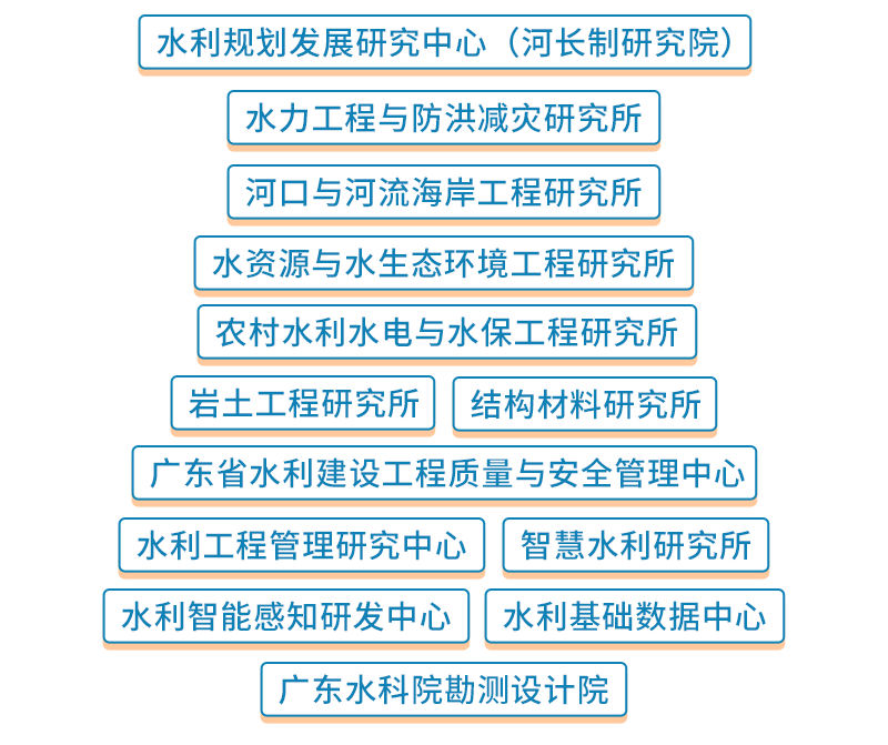岩土工程研究所、结构材料研究所、广东省水利建设工程质量与安全管理中心、水利工程管理研究中心、智慧水利研究所、水利智能感知研发中心、水利基础数据中心、广东水科院勘测设计院。