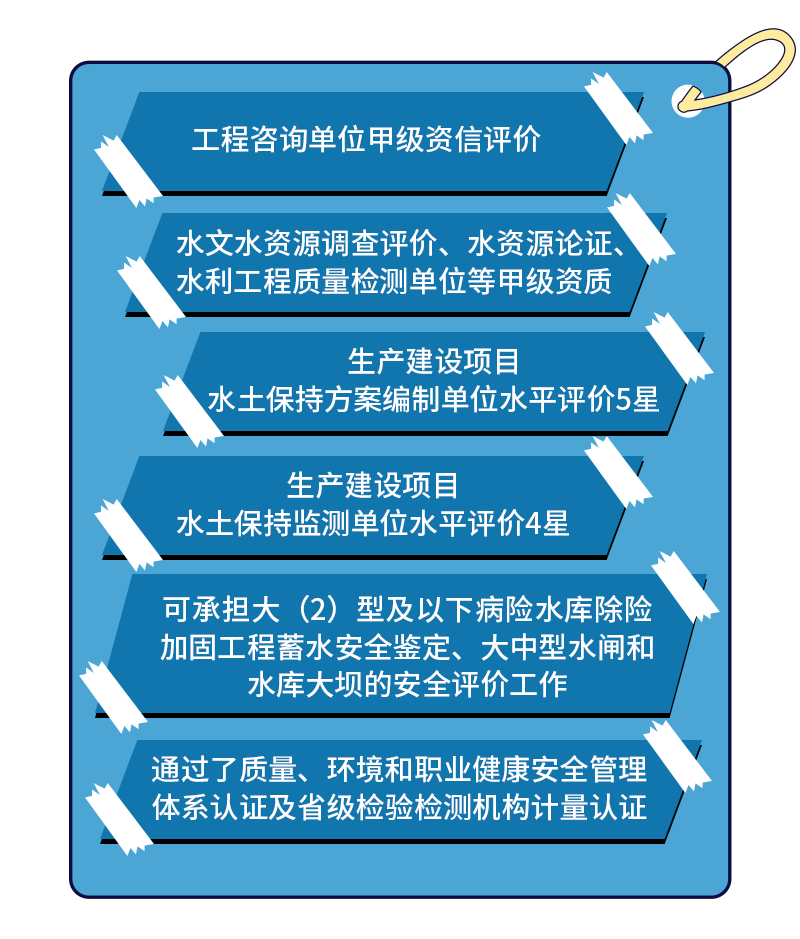 水文水资源调查评价、水资源论证、水利工程质量检测单位等甲级资质;