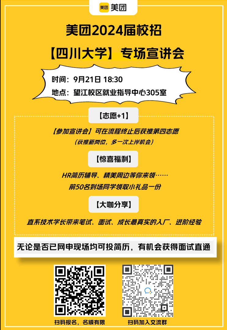 【美团-川大】宣讲会来啦!!【时间】9月21日 18:30【地点】望江校区就业指导中心305室【业务多元】无人机、无人车……软件、【硬件~机械结构、嵌入式、机器等】岗位大量需求【直通面试机会】无论是否网申,现场带简历投递,有机会获得面试直通卡【志愿+1】【参加宣讲会】可获推第4个志愿(4个志愿,多一次上岸机会)【精美礼品】前50名同学可获精美小礼品、还有终极大奖等你来【求职技巧】大咖、校友分享、HR简历辅导助你快人一步