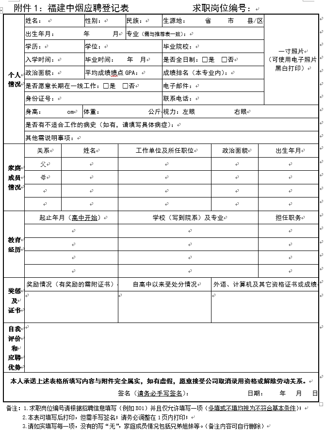 1.【必须】word版《福建中烟应聘登记表》(附件1,或福建中烟官网https://www.fjtic.com.cn/人才招聘模块下载);