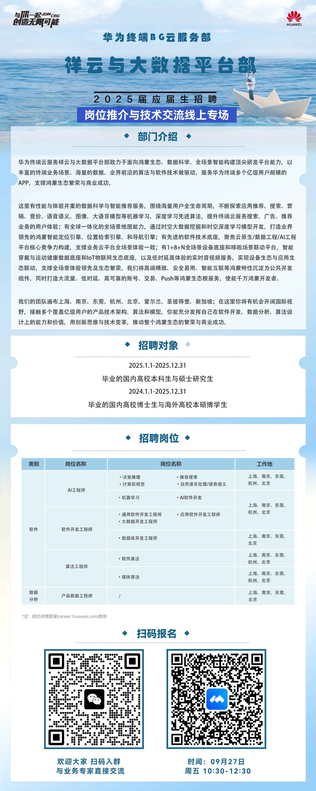 【欢迎扫码入群交流-校招宣讲】华为终端BG云服务祥云与大数据平台部2025届应届生岗位推介与技术交流线上专场来啦~