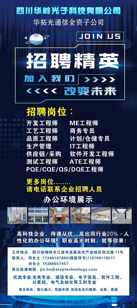 华拓光通信自成立以来,业绩持续攀升,产品多元化,并且拥有自己的技术和专利,为全球云计算和大数据中心、数据通信、存储网络、长途传输、无线接入等领域客户提供最佳的光通信的解决方案。华拓拥有一批高素质的核心管理层和经验丰富的技术团队,汇集了一批行业内最优秀的人才。团队精神是华拓发展的要义,以团队的共同创造力来推进企业的各项发展,并给每一位员工提供一个广阔的发展平台。所有华拓人的共同努力使得华拓的产品处在行业的最前沿,并为企业赢得了多项荣誉,如国家级高新技术企业、创新发展企业、全国工人先锋号、四川名牌等。