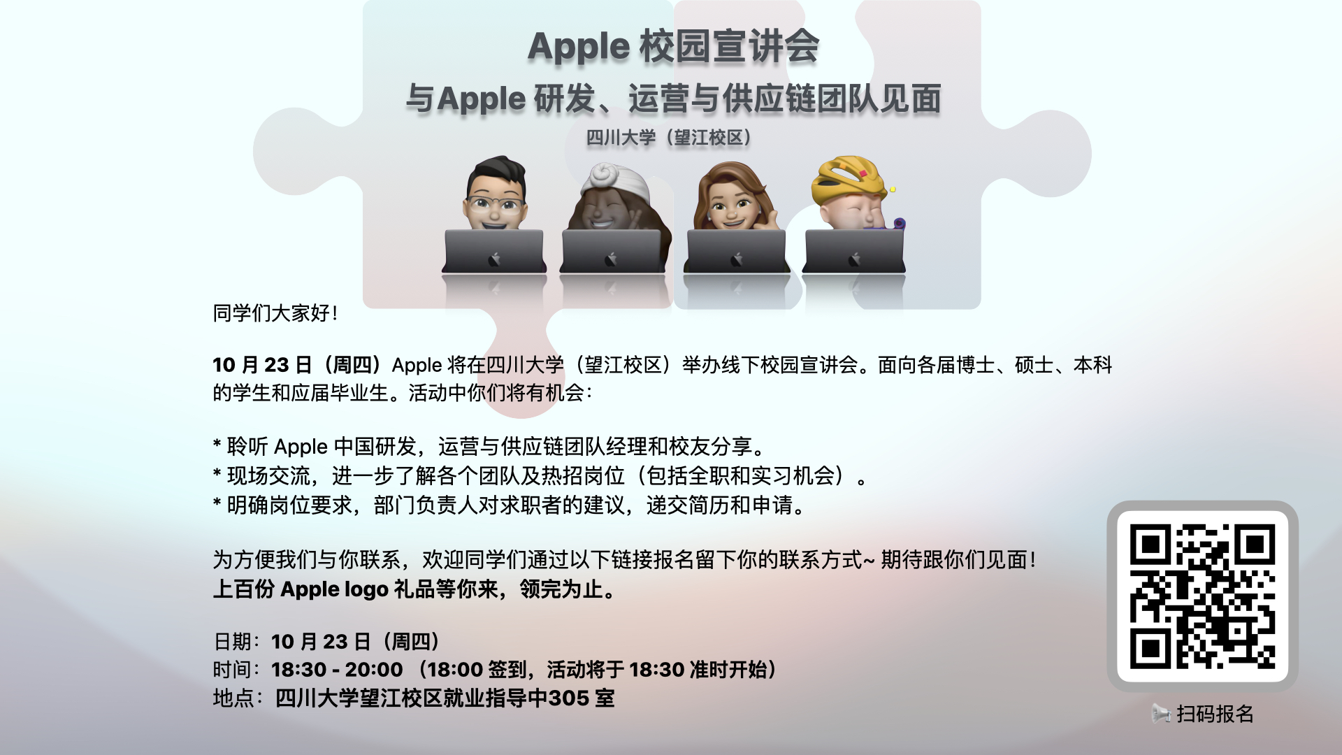 10月23日(周四)Apple 会在ok138cn太阳集团(望江校区)举办线下校园宣讲会,非常希望能邀请2027届及以后的理工专业的本科、硕士、博士的同学们前来参加。