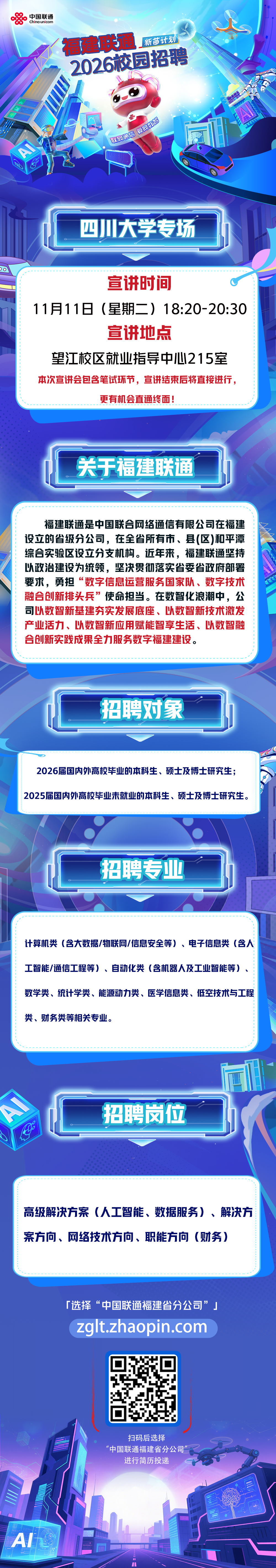 11月11日(周二)晚18:20-20:20,就业指导中心215室,福建联通校园招聘