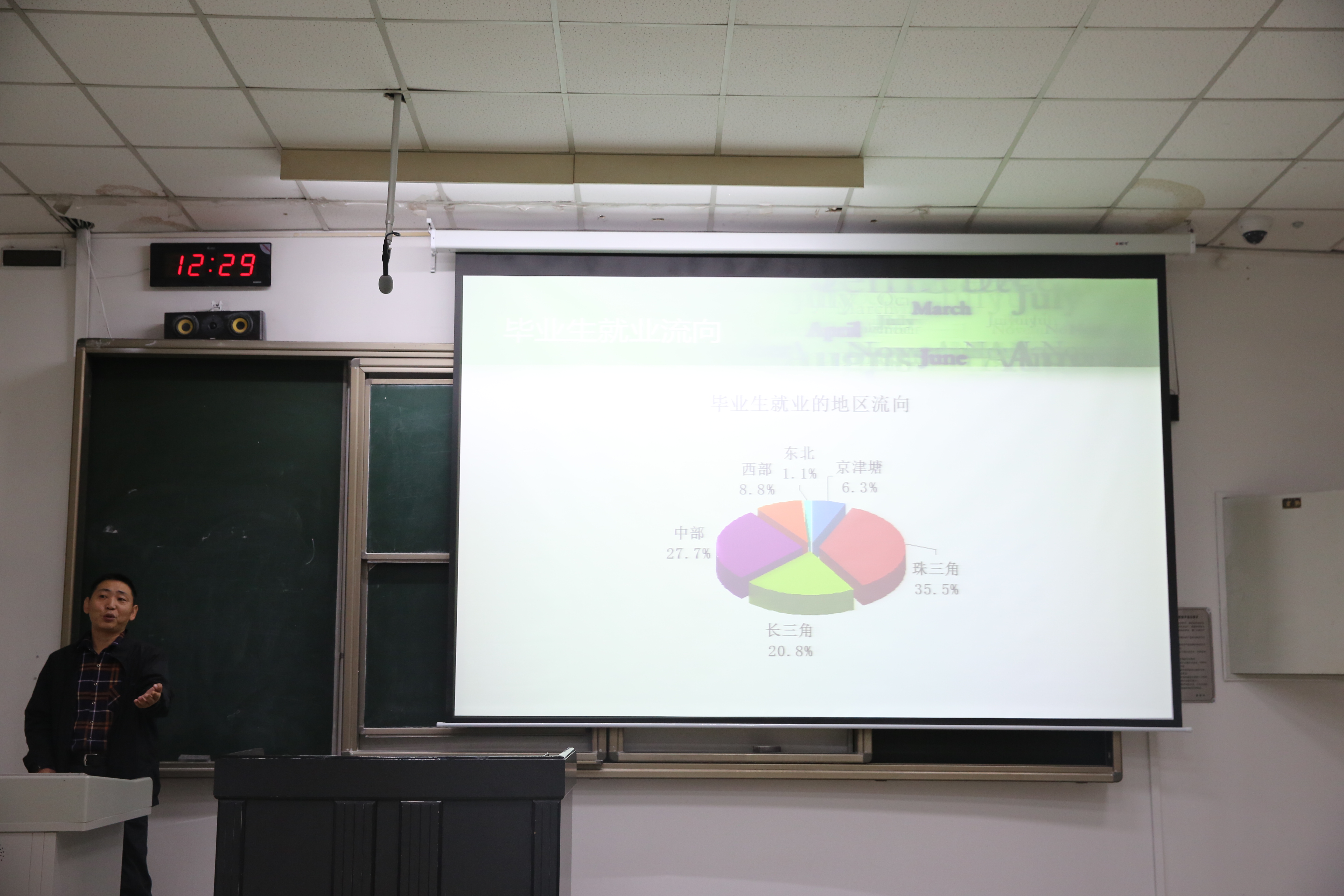 最后,陈书记为同学们进行了就业现状分析。结合当前社会经济发展大环境和国家经济状况,陈书记分享了近几年来毕业生就业数据和概况,分析了就业压力。同时根据学校和专业的特点,陈书记进行了针对性分析和讲解,他列举了很多历年成功就业和就业不理想的例子,建议同学们端正就业态度,切实地向同学们传递了就业经验和教训。陈书记希望同学们的选择不仅适合自己而且适合国家的发展需求。