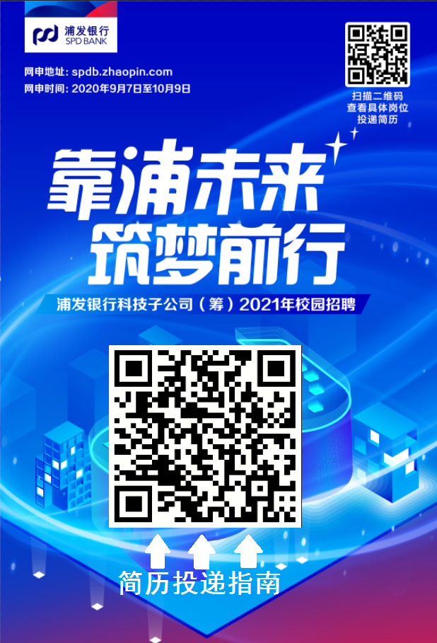 请点击链接 http://spdb.zhaopin.com, 进行在线应聘报名申请,开放时间 2020年9月7日10:00-10月9日18:00。