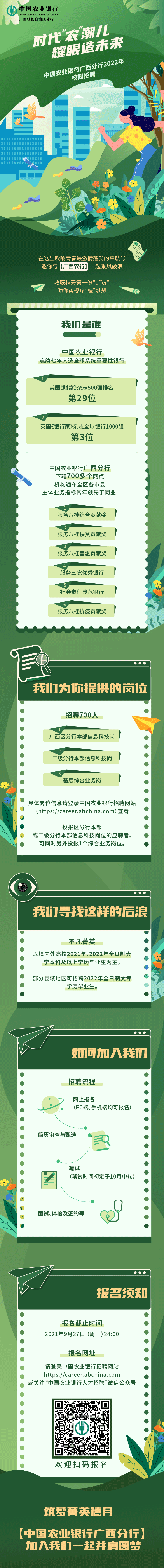 【时代“农”潮儿,耀眼造未来】—中国农业银行广西分行2022年校园招聘正式启动!大型国企广阔的发展平台完善的激励培养体系【招聘需求】700人(信息科技岗、综合业务岗)【报名网申】https://career.abchina.com/buildMobile/index.html#/OrgPositionList/99/1619,249,-1【报名截止时间】2021年9月27日(周一)24:00中国农业银行广西分行加入我们一起并肩圆梦