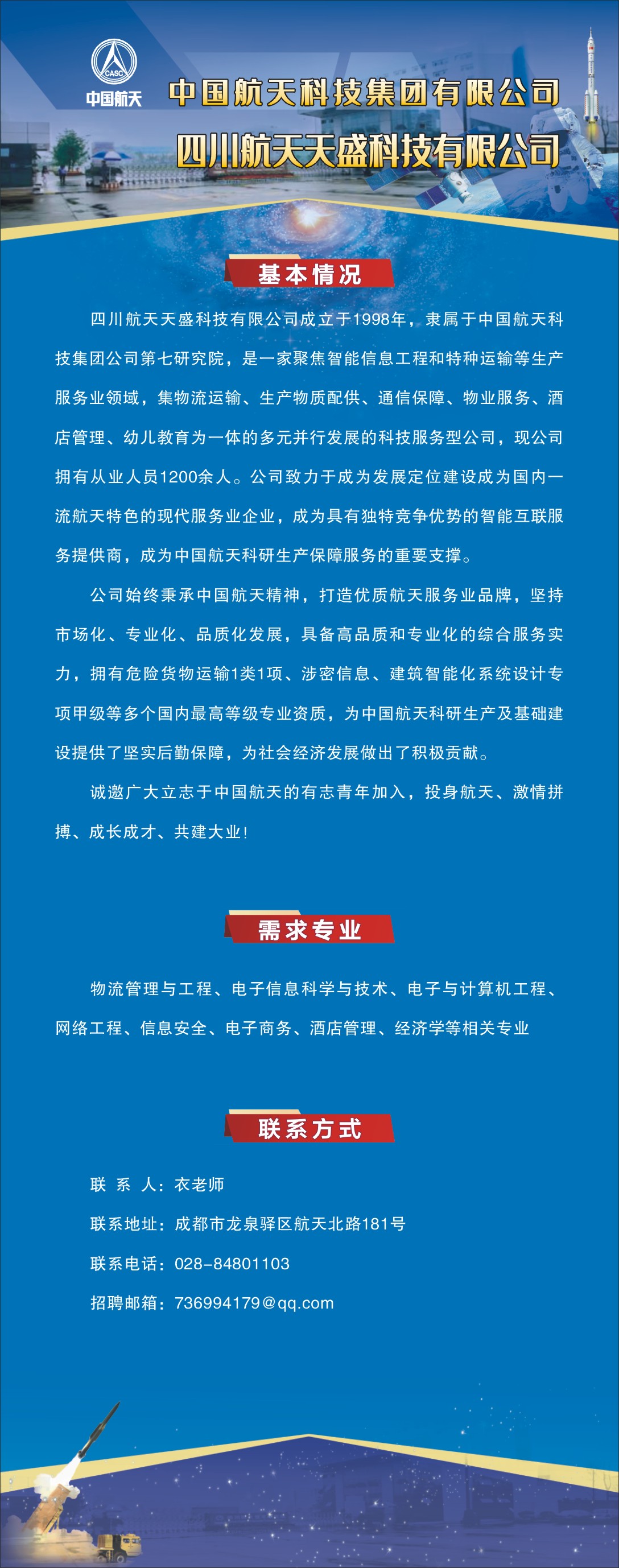四川航天技术研究院宣讲会四川航天天盛科技有限公司需求专业:电子信息工程(卓越工程师班)、电子信息科学与技术,模式识别与智能系统时间:9月26日下午3点20到5点20地点:ok138cn太阳集团望江校区就业指导中心301报告厅简历可投递至邮箱:2048741334@qq.com
