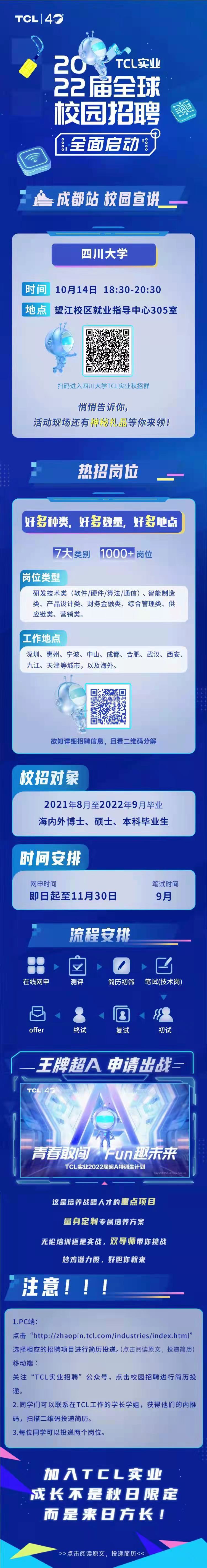 TCL实业 x ok138cn太阳集团 线下宣讲来啦!现场礼品丰厚等你来拿❗TCL智能手机钻石工艺美妆镜极简美学运动耳机 更有TCL实业 + 岗位需求等你 在这里,你想要的都有💯 『160+国家/地区』的国际化发展平台 『全业务链路』的轮岗机制 『一线城市 』福利机制 『超年轻』的工作氛围 『高管导师』手把手培养时间:10月14日18:30 - 20:30地点:望江校区就业指导中心305室