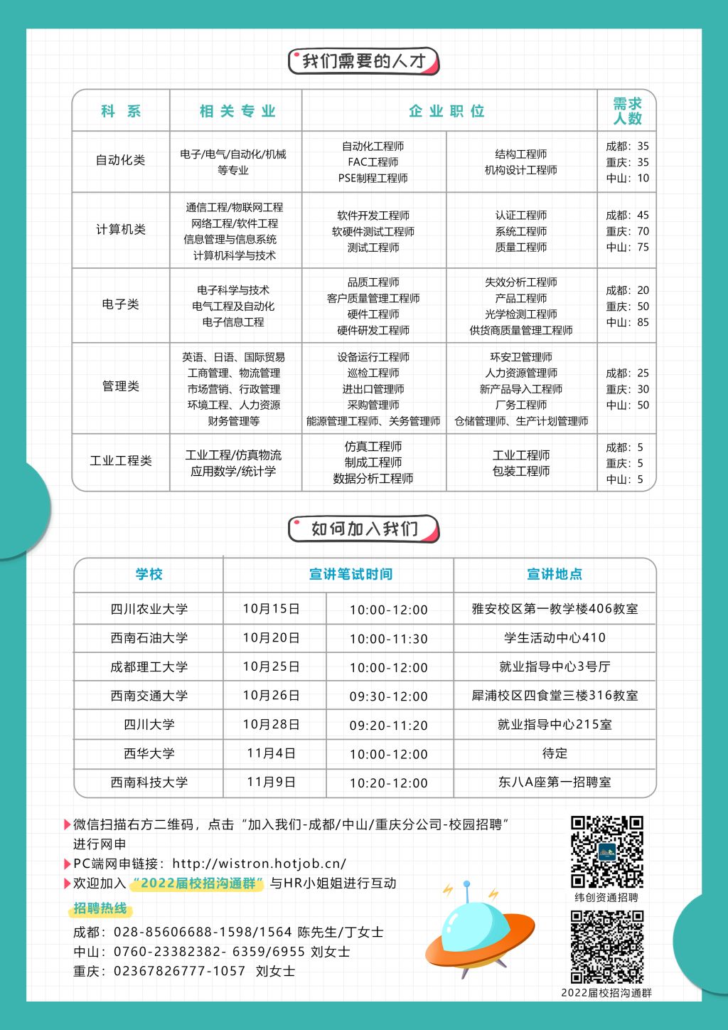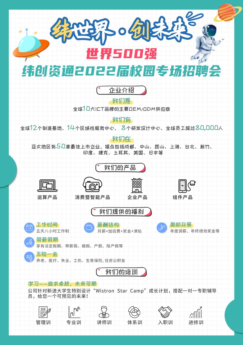 因学校疫情防控政策,纬创原定10/28上午在就业指导中心215室宣讲会已取消,现诚邀各位同学参加纬创资通2022届校招空中宣讲会(ok138cn太阳集团专场)