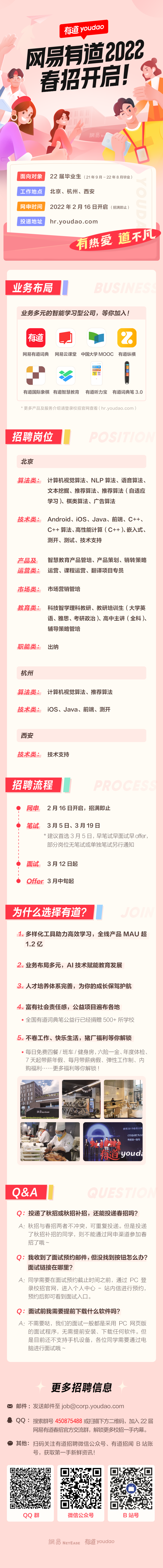 【网易有道2022春季校园招聘开启】一、岗位:技术类、算法类、产品及运营类、市场类、教育类、设计类、职能类等海量岗位!(具体细类详见校招官网)二、工作地点:北京/杭州/西安三、招聘流程网申——笔试——面试——Offer网申时间:2月16日开启,招满即止笔试时间:3月5日(首选),3月19日面试时间:3月12日起四、22届网易有道春招官方交流QQ群【450875488】意向投递同学请前往网易有道校招官网(hr.youdao.com)进行网申,我们期待你的加入🤩🤩🤩!