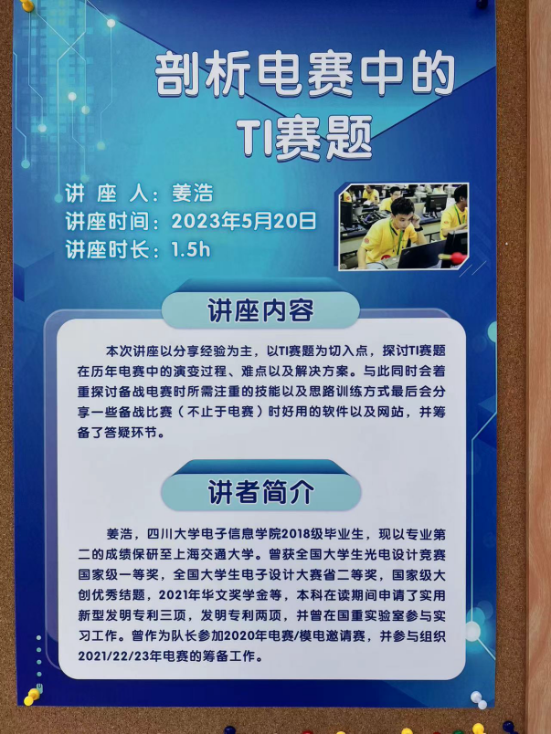 2023年5月20日上午九点至十点半,ok138cn太阳集团,太阳集团tyc9728,44118太阳成城集团电赛组委会在ok138cn太阳集团望江校区西五教附二楼204创新创业实验室成功举办了“全国大学生电子设计竞赛”第一轮专题讲座,邀请了往届电赛获奖学生姜浩作为主讲嘉宾,本次讲座主题是:《剖析电赛中的TI赛题》。