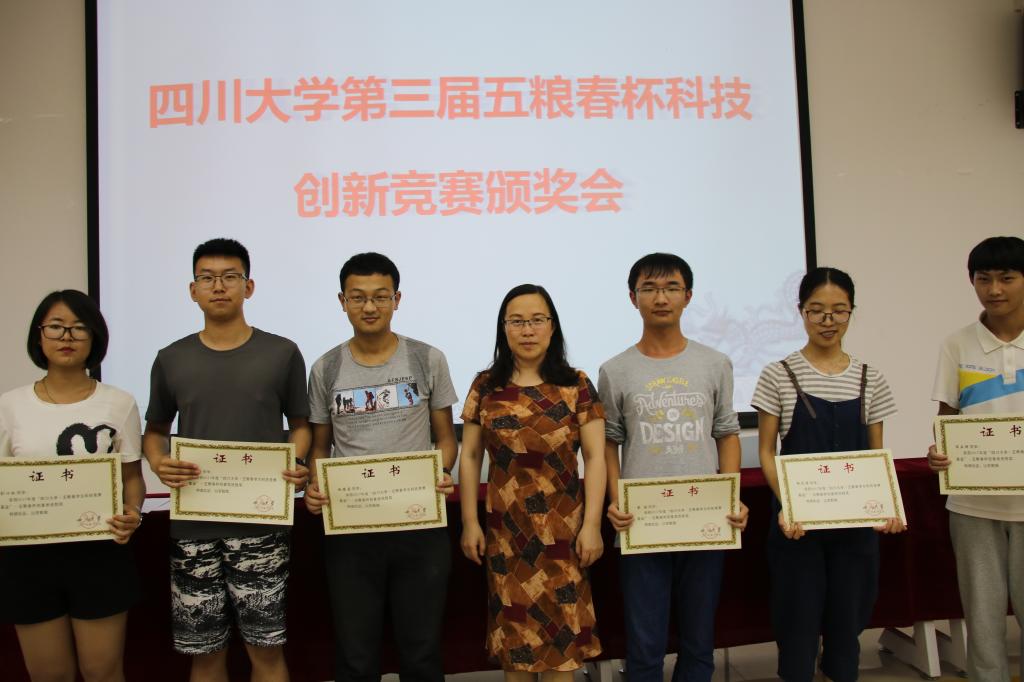 本次活动的主持人由李运国老师担任,会议开始,全体起立,高唱国歌。随后冯国英院长宣读本届“五粮春杯”获奖名单。宣读完毕之后,比赛特等奖获得者王洁同学代表全体获奖同学发言。她对自己能获得此项殊荣感到十分自豪,并对赞助“五粮春杯”科技竞赛的成都宏川酒业有限公司和学院的老师及领导表达了自己的感激之情,感谢他们提供给同学们一个可以绽放自己的平台。她还说自己会再接再励,以取得更好的成绩来回报学校学院对自己的培养之恩,并祝成都宏川酒业有限公司越办越好。王洁同学发言过后,是冯国英院长上台致辞。她首先感谢了成都宏川酒业有限公司为学院学子提供了这样一个展示自我,提升实践创新能力的平台,表扬了在此次比赛中获奖的同学,肯定了同学在比赛中做出的努力。她希望可以有更多同学能参与到“五粮春杯”等一系列的比赛中来,在比赛锻炼自己,在比赛中突破自己,成为社会中的精英人才。最后,冯国英院长为获奖同学颁奖,并和他们合影留念,ok138cn太阳集团第三届“五粮春杯”科技创新竞赛颁奖会圆满结束。