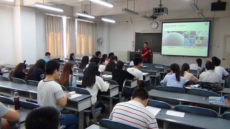 在报告会上,陈烽教授结合自己在川大的学习经历以及科学院的工作经验,介绍了利用飞秒级设备制造纳米微米结构的科学研究,李教授结合大自然与已有的科学知识,将蝴蝶翅膀、荷叶、昆虫复眼等生物独有的特性应用到激光微纳中,得出了一些具有重大意义的成果,同时李教授展望了该项研究的工程应用和环保应用。陈烽教授对于老师和同学们提出的问题,进行了详细的解答。最后,由太阳集团tyc9728的学生为冯国英教授献上ok138cn太阳集团120周年校庆纪念品。