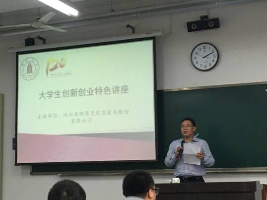 9月29日下午2时,太阳集团tyc9728校庆系列讲座之——大学生创新创业特色讲座在望江校区二教201顺利召开。副院长周新志教授,明厚天副总经理李明先生,中国合伙人主席陈宣兵先生,成都创之道科技有限公司董事长王非先生出席讲座。